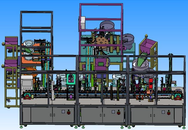 全自动组装机通过各零件、送料、判断、抓取、装配、位移检测、装O型圈、打卡簧、扭力(旋转灵活性)测试、自动卸料等工艺对产品进行装配。所有送料装置经过特殊处理,各零部件表面无划伤,换型时在触摸屏点一下就可以,换型方便快速。